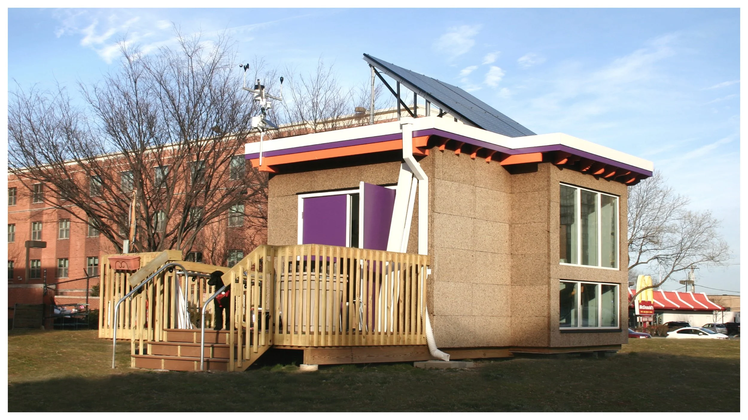 The structure integrates net-zero strategies including a high-performance thermal envelope, solar PV panels, rainwater harvesting, vegetated roof, thermal energy systems, and a composting plumbing system—offering a real-world model of sustainable design and interdisciplinary collaboration.